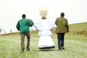 当地时间2月24日,英国萨里郡惠兰农场,两个农民以美国女星Lady Gaga为原型制作的稻草人。他们希望这个稻草人能吓走鸟兽,保护庄稼。