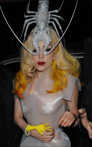 中新网3月2日电 “百变天后”Lady Gaga刚完成一连两场伦敦演唱会,有传上周五首场表演因超时45分钟而遭场馆罚款19,000美元,却没有阻她第二天到伦敦著名高级中菜馆举行庆功宴的兴致,为了配合餐厅气氛,她竟想到把一只银色龙虾放上头当帽戴,不知同去就餐的美国摇滚歌手Bruce Springsteen是否已经见怪不怪。