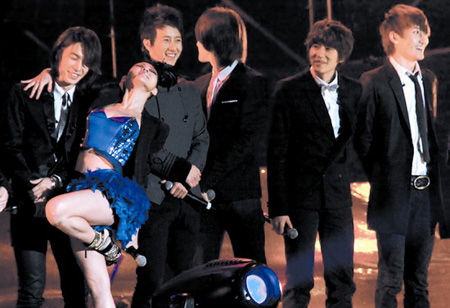 14日晚,“康熙盛典”全国巡回演唱会杭州站开演,现场嘉宾不论男女,一律没能逃过小S的“魔爪”。因为Super Junior-M组合人数众多,小S用领带、葡萄和腰带等道具一个一个戏弄过来,最后更是大胆熊抱了韩庚。(苏郁)