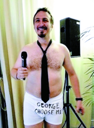 出人意料的是,一名意大利男记者也向乔治索吻:“乔治,选我,选我。我能吻你吗?就一次!”说话间,他脱去上衣和裤子,只剩黑领带和短裤,短裤前面还写着“GEORGE,CHOOSE ME(乔治,选我)”。克鲁尼处变不惊,微微一笑:“你敢冒这么大的风险非常勇敢,可惜它并不奏效。不过,你的领带非常漂亮,而且很长。”克鲁尼的幽默引来全场大笑。