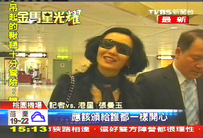 据“东森新闻”消息,墨镜、丝巾,肩上充满造型的包包,港星张曼玉一身流行打扮现身桃园机场。记者:“大概心里有没有想说一个名单?”港星张曼玉:“嗯,没有,我觉得颁奖嘉宾,不应该这样想,应该颁给谁都一样开心。”