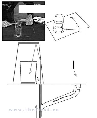 网友分析:在这个魔术中,我们可以注意到,大杯与小杯中间仍有缝隙,大杯是倒着放的,小杯则是正立着套在大杯里的。黑色的桌布主要是为了掩饰从桌下弹射硬币的出口。在表演时,刘谦攥着硬币的手曾一直放在桌子的左下角,其实那里正是硬币进入的地方。经过桌下的机关,硬币顺势滑到杯子下方。观众们看到的是硬币从小杯子与大杯子间的桌面射进大杯然后被大杯壁和大杯底2次反弹后落入小杯中的。经推断,刘谦应该还在桌子某个位置布置了一个弹射硬币的机关,从而让硬币从桌布下面射出来。