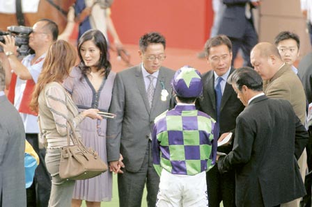可能得知有传媒守候,两人醒目地不从会员席入口进入马场,成功避开记者,直至第3场赛事开始前始见二人甜丝丝走到沙圈。李嘉欣身穿浅紫色连身百折裙,明艳照人,与打上紫色花纹呔的许公子可谓衬到绝。两人特别痴缠,全程十指紧扣,即使在沙圈内与练马师告东尼夫妇及骑师汤智杰商讨战略时,许晋亨也没放开伊人的玉手,李嘉欣更不时展露幸福笑容。可惜“醉激”最后只跑得第2名,大家无缘得见大美人甜蜜拉头马的温馨场面。