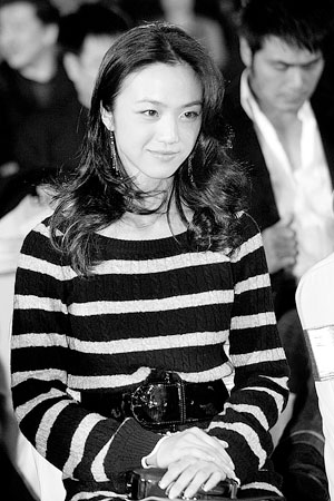 汤唯身穿一件黑白相间的毛衣,系一条黑色腰带,黑袜黑靴,与参加台湾金马奖时盛装打扮相差甚远。