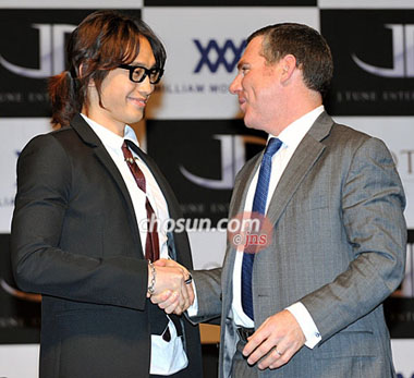 Rain和WMA副总约翰迈斯(John Mass)开心地笑着握手。