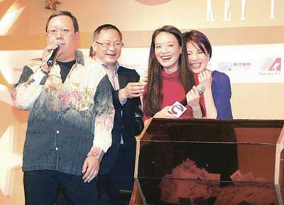 林建岳(左起)、杜琪峰、舒淇与杨千嬅在台上玩得打成一片。