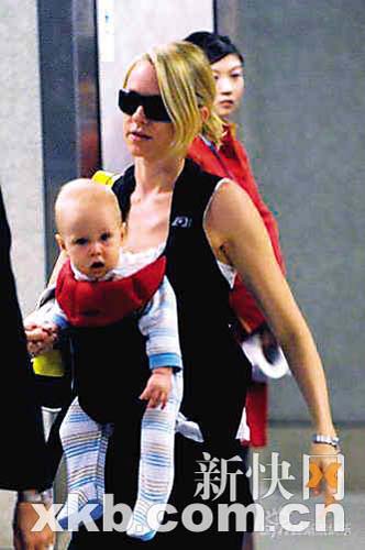 3月10日,女星娜奥米·沃茨(Naomi Watts)带着儿子从澳洲飞回洛杉矶。身形瘦小骨瘦如柴的沃茨将胖嘟嘟的儿子“挂”在了胸前,小家伙非常听话,用好奇的眼光打量着摆在面前不停闪烁的镁光灯和镜头,可爱至极。