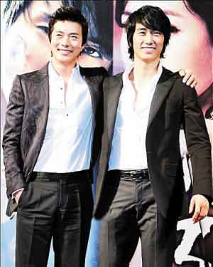 17日晚,《宿命》首映礼在首尔举行,两大主演宋承宪、权相宇一同出席了仪式,互搂着膊头做宣传,非常亲昵。不过两人在戏中却演绎由好兄弟变仇人的故事,权相佑扮演背叛兄弟的大反派,影片将在20日在韩国上映。因为权相宇和宋承宪在亚洲的人气,首映式还吸引了约100名来自中国、日本等亚洲其他国家的fans。