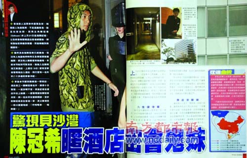 周刊还爆出,一直有吸烟习惯的陈冠希住在酒店吸烟层9楼,而且他已经与酒店达成协议,一旦有需要,可利用酒店的特殊通道出入。