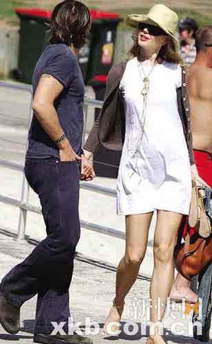 妮可·基德曼与丈夫基思·厄本携手漫步沙滩,腹部高隆,孕味十足。