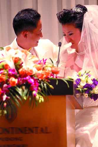 下午3点左右,酒店工作人员开始布置场地,从鲜花拱门装饰到三层婚礼仪式鲜奶蛋糕,基本上是酒店一条龙服务。舞台拉起了一层白色的薄纱,一个大红色喜字悬挂在正中。王志文和陈坚红结婚走的是“中国风”路线,婚纱照上两人穿着唐装。酒店会送出一套价格偏贵的房间给新人“闹洞房”。工作人员透露:“价格差不多是3000元一天。”