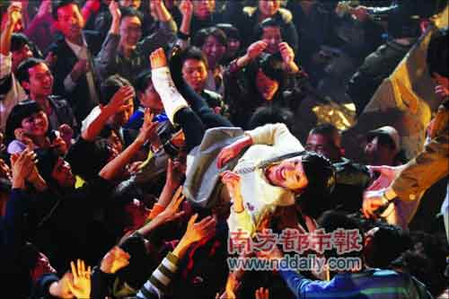 周迅在片中号称饰演12个角色,当天她的戏份却非常独特:在摇滚演唱会现场,人群中忽然躁动起来,歌迷以摇滚演唱会上最常见的人体输送带的方式将她传送到了舞台上!而周迅的脚上竟然打着石膏绷带。