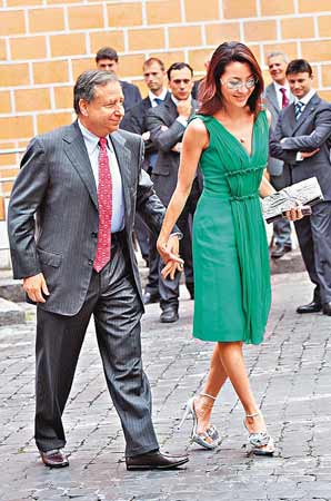 中新网6月17日电 杨紫琼与法籍未婚夫Jean Todt上周去到意大利罗马,出席意大利富商Flavio Briatore与Elisabetta Gregoraci的婚礼,身穿绿色连身裙的杨紫琼,与JeanTodt手拖手步入堂观礼,尽显恩爱。
