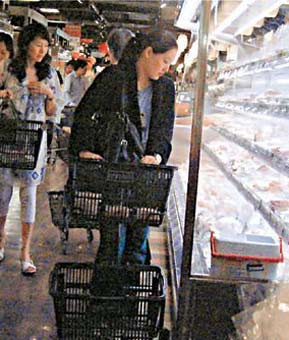 伏明霞产后变身家庭主妇,梁锦松蹲在地上帮老婆挑选商品。