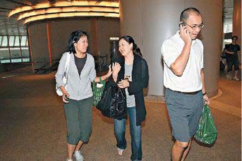 伏明霞(中)拿着大袋食物与友人离开,见记者拍照,刻意收腹。