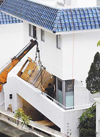去年底刘嘉玲位于香港山顶新居,用吊车把冰箱送入宅。