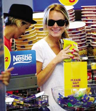 林赛·洛韩和DJ女友萨曼莎·罗森趁拍摄电影《产前阵痛》的间隙漫步在好莱坞北部的街头,看起来十分甜蜜。她们先到一家音像店挑选光盘,然后又一同前往超市购买美味零食。两人一路上有说有笑,看上去非常开心。