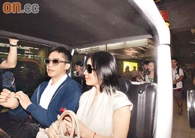 两人坐机场小车离开,被传媒围堵采访。香港《太阳报》图。