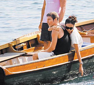 章子怡靠在船舷边拨水,右手仍紧揽男友。