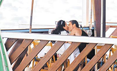 章子怡身穿白上衣和花色短裤,和未婚夫脚踩情侣人字拖,一派轻松地在水上餐厅用餐,席间有说有笑,她还拿相机朝男友猛拍,并伸手搭上他的肩,2人当众热吻。