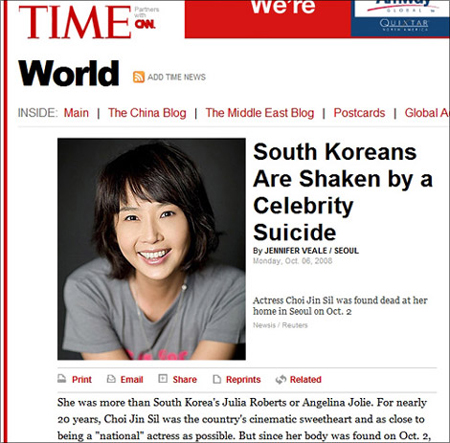 中新网10月8日电 “韩国社会对著名演员崔真实的自杀负有一定责任。”就在美国的主流媒体争相报道崔真实去世的消息时,美国《时代》杂志不惜笔墨对崔真实之死进行了大规模的报道,引起了广泛的关注。