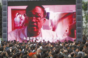 龙华殡仪馆的大厅外挂着四幅谢导的大型肖像,都是谢导生前工作生活时的日常照,另外一边高达四米的巨型屏幕则不断播放着《红色娘子军》、《天云山传奇》等谢导生前作品的片段。影迷们驻足其下,回忆着谢晋带给他们的感动,久久不愿离去。