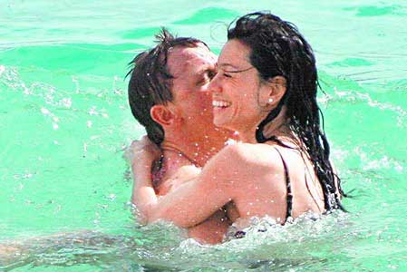 中新网12月30日电 “007”丹尼尔·克雷格(Daniel Craig)新片《007量子危机》票房不俗,他开心带着女友米歇尔享受假期。两人上周飞到加勒比海躲避伦敦寒冬,在温暖的海水里打情骂俏,亲热画面简直就是他在《007首部曲:皇家夜总会》和庞德女郎伊娃葛林调情的翻版,真是戏里戏外都在演庞德。