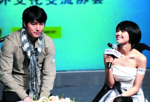 刚在亚洲电影大奖中夺得“最佳男配角”的韩星郑宇成,日前偕高圆圆、“超女”谭维维等人在北京出席电影《成都,我爱你》记者会。