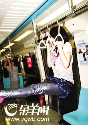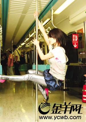 除了玩游戏机,Jolin更是现场的开心果,看见捷运车箱内的手扶柱子,Jolin一直技痒再度跳起高难度的钢管舞蹈,只见她在柱子上爬来飞去,让经过车厢外的老伯伯与学生们惊讶不已。钢管舞蹈跳不过瘾的Jolin干脆把车箱内的拉环当作体操用的拉环,做出不少个需要肌耐力的标准拉环平衡动作,让在场工作人员啧啧称奇。