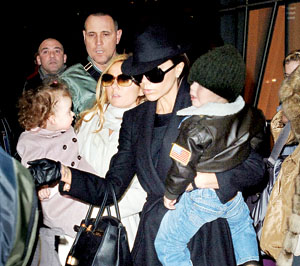 “时髦辣妹”维多利亚·贝克汉姆紧随其后。黑风衣、大墨镜、黑帽子——帽檐儿压得很低几乎看不到她的眼睛,脸上不带丝毫笑容。不过她怀里抱着一个小孩——小儿子克鲁兹,这个小家伙也穿着黑色皮衣,他好奇地打量着欢呼的人群,一脸茫然。