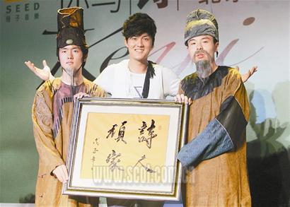 因为与“诗”有关,在昨日的发布会上,最先上场的不是主角吴克群,而是“穿越时空”前来捧场的中国古代先贤:最著名的大诗人“李白”、“杜甫”。在现场所有人的惊呼声中,两位年轻演员所扮演的大诗人,却显得心神不定,他们铺垫说:“得知今天有一位学贯古今、又能写诗、又能唱歌的当世才子即将到来。”这时,吴克群才现身,并为两位诗人解开了疑惑,还慨然应允“李白”、“杜甫”来考验他,即兴将两位诗人的名句用吉他弹唱出来。吴克群的才华让两位“先贤”频频点头,并当场宣布吴克群为“诗人顽家”并送上金匾。