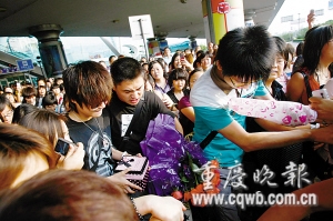 李宇春乘坐的航班计划是在昨下午5时左右抵达,4时后江北机场的3号出口就已聚集了三四百名玉米,喊着他们自己的口号:“李宇春,重庆的”。每位玉米手上戴有一根黄丝带,很有秩序地分成两队留出了约两米宽的通道,队伍最前面有十多名玉米,只待李宇春一出现,就组成人墙将其包围,以防止李宇春被热情粉丝抓到。