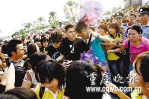 李宇春昨日抵达重庆江北机场,并将于今日在北碚参加一慈善活动。玉米们闻风而来高调接机。由于李宇春没有走玉米们用人墙组成的通道,导致以讲秩序著称的玉米出现混乱场面。