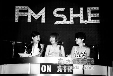 距离上一张《PLAY》专辑已经过了将近1年半,即使唱片市场越来越不景气,但《FMS.H.E》的台湾预购量还是冲到了4.2万张,让S.H.E又惊又喜。前日在重金打造的豪华旋转DJ台上,身着美丽小礼服的S.H.E三人,不仅声音悦耳,身材也让大家惊艳,可惜播报新闻时轮流吃了几次螺丝,把严肃的新闻报得笑果十足(见右图)。事后她们忍不住娇嗔:“舞台正前方的聚光灯太强了啦,让我们看不清楚稿子,平常录电台节目时,并不会这样的嘛。”