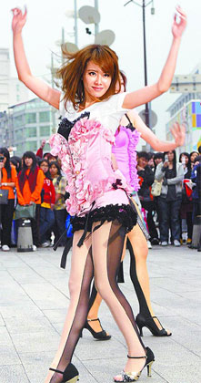 中新网3月28日电 蔡依林(Jolin)昨日(27日)在西门町封街拍新歌《花蝴蝶》舞蹈教学示范带。Jolin身穿粉红马甲、黑色蕾丝边粉红小热裤,脚上已舍弃美美高跟鞋,改以专业的国标舞鞋上阵,只为了避免脚踝旧疾复发。