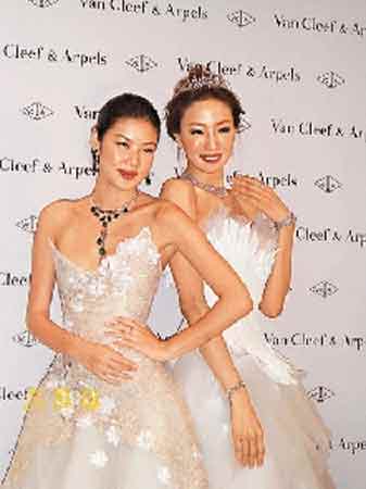 中新网5月23日电 据香港文汇报道,乐基儿和陈嘉容前晚齐齐穿起婚纱为一个珠宝品牌行走秀,乐基儿还戴上价值逾三千万元的绿宝钻饰,艳压全场。