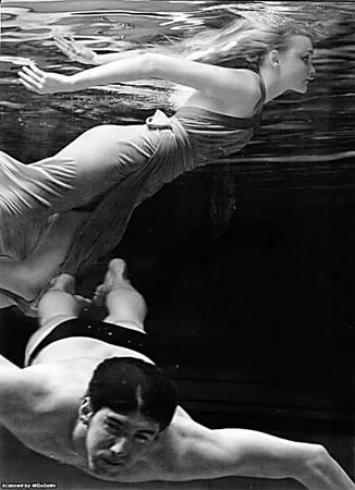 美国游泳天才菲尔普斯与名模卡罗琳·特提妮共同为某杂志拍摄了一组水中写真。两人在水里演绎浪漫情调。