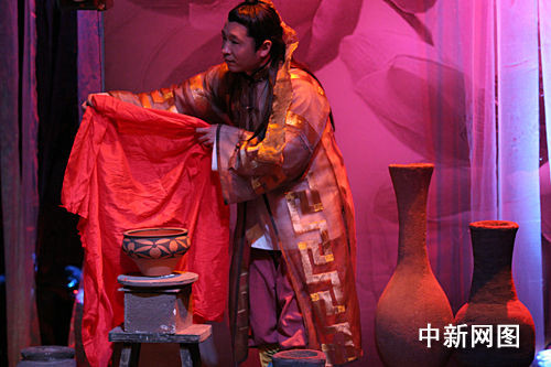 该剧是以发生在渑池仰韶村一个陶艺世家的制陶故事为背景,通过秦王的儿子邂逅彩陶女所产生的爱情故事为主线,整个剧情起伏跌宕,台词风趣幽默,令观众沉醉在悲喜交加的人物命运中。影视戏剧演员张成晓勇的精彩演绎博得了全场观众的阵阵掌声和喝彩。当绚丽的舞台灯光变幻出满场旋转的来自渑池县仰韶村彩陶坊的精美彩陶时,把整个剧情推向了高潮,令在场的首都观众惊叹不已。朴拙俊美的仰韶彩陶的确是在金黄的季节里给首都的观众上了一道视觉文化大餐。