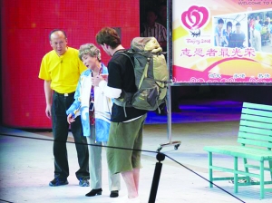 情节:北京奥运会期间,蔡明十分羡慕志愿者。她遇见了穿着志愿者服的郭达,于是缠着他,要跟他一起帮助来北京的客人。两人遇见了急着找厕所的韩国小伙子,因为听不懂小伙子说啥,折腾了半天才明白过来,直把小伙子急得捂着小腹,满地乱跳。接着两人遇见了迷路的美国小伙子。美国小伙子只会说简单的中文,郭达只会说Welcome to beijing这么一句外语,于是又是一阵瞎闹腾。蔡明指手画脚,希望用肢体语言让小伙子明白各种地名,但越搞越乱。此时,真正的志愿者上场,原来郭达只是穿了人家晾在外面的志愿者服。蔡明、郭达失落之时,遇见走失了新郎的新娘,两人想尽办法帮她找到了新郎,十分高兴,最后大家边为观众发喜糖边退场,喜气十足。
