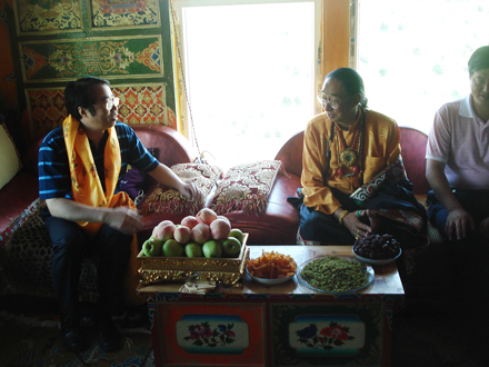 许又声与朗扎活佛亲切交流。朗扎·依加拿布是回国定居藏胞,朗扎觉姆寺活佛。1958年到印度朝佛,几年后到瑞士,1978年回国定居。