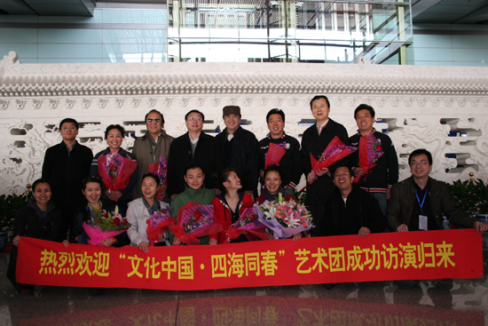中新社北京3月9日电 (南若然)结束在南美四国23天的慰侨巡演之后,9日下午,“文化中国·四海同春”赴南美洲艺术团载誉返回北京。该团团长、国务院侨办副主任马儒沛在首都机场接受中新社记者采访时表示,赴南美巡演“鹏程数万里,广交四方友,笑迎八面风,演绎中华情”,并创造了四个之最。