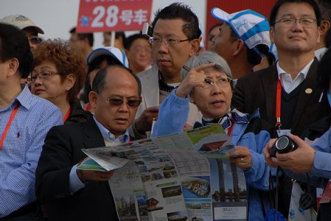 日本华侨夫妇在研究世博观光线路