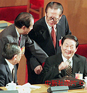 江泽民、朱镕基、李岚清、钱其琛在九届全国人大三次会议闭幕会上交谈。