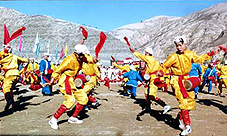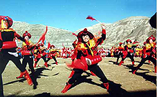 安塞位于陕北高原,那里的腰鼓历史悠久,格调古朴。人们在欢度节日,庆祝丰收的时候,都要演出腰鼓助兴,每次演出的阵容都很大,一般都有60名左右的鼓手。有时几个队连在一起,能拉开一两里路距离。腰鼓手们的装束一律着古代将士的便服,或黄或红包头,素色衣服,显得整齐壮观。电影《黄土地》里的腰鼓手们穿着黑色,想必是为了渲染贫苦背景。实际上,过去上场表演的腰鼓手们,很少有穿皂服的。